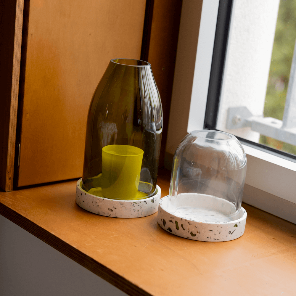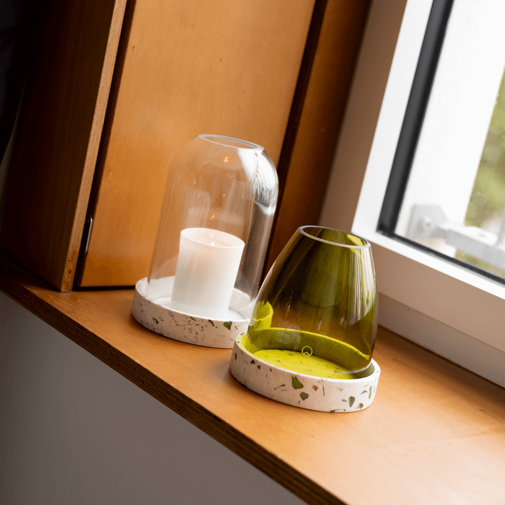 Le socle du photophore est réalisé à partir de notre composite Istrenn, mêlant coquilles d’huîtres broyées mais pas seulement, puisque nous y incorporons également des éclats de verre, issus des chutes de production de Q de Bouteilles. La cloche en verre est, quant à elle, façonnée à partir d’une bouteille magnum recyclée par Q de Bouteilles. Chaque photophore Malàkio x QDB Editions est unique, doté d'un rendu minéral et texturé qui raconte l’histoire de ses matières premières. N'hésitez pas à accompagner votre photophore Malàkio x QDB Editions d'autres coloris et tailles de la même gamme afin de créer un parfait mix & match.
